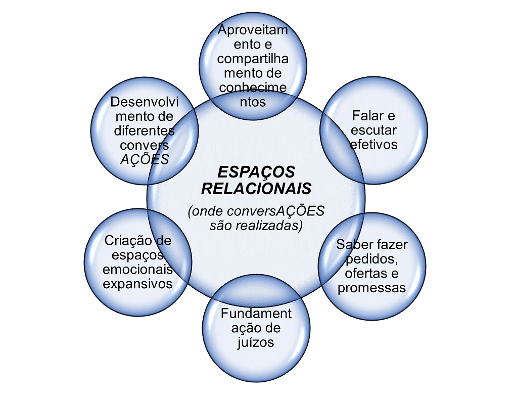 - Desenvolvimento de diferentes conversações: No dia a dia, as pessoas geralmente não param para refletir sobre como as conversas que estão realizando colaboram para a construção de ações com outras pessoas, grupos ou organizações. Elas simplesmente trabalham dentro de redes de compromissos, alimentadas por diferentes tipos conversas, integradas a outras redes de compromissos que, juntas, compõem espaços relacionais cada vez mais complexos. Entretanto, o desenvolvimento de uma conversa, mesmo que de forma inconsciente, requer a seleção de um certo conjunto finito de possibilidades de ações. Trata-se de uma dança que dá a cada parceiro algum nível de iniciativa em uma sequência de atos de fala que culminam em diferentes tipos de compromissos.